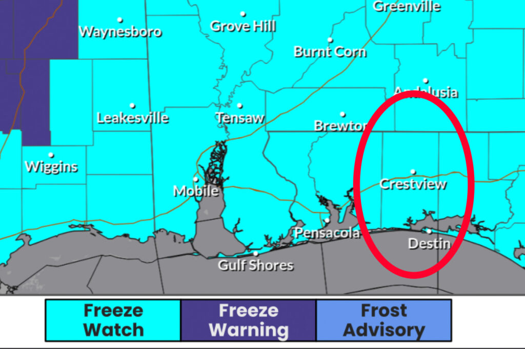 Freeze watch issued for Okaloosa County Monday night as record cold snap expected