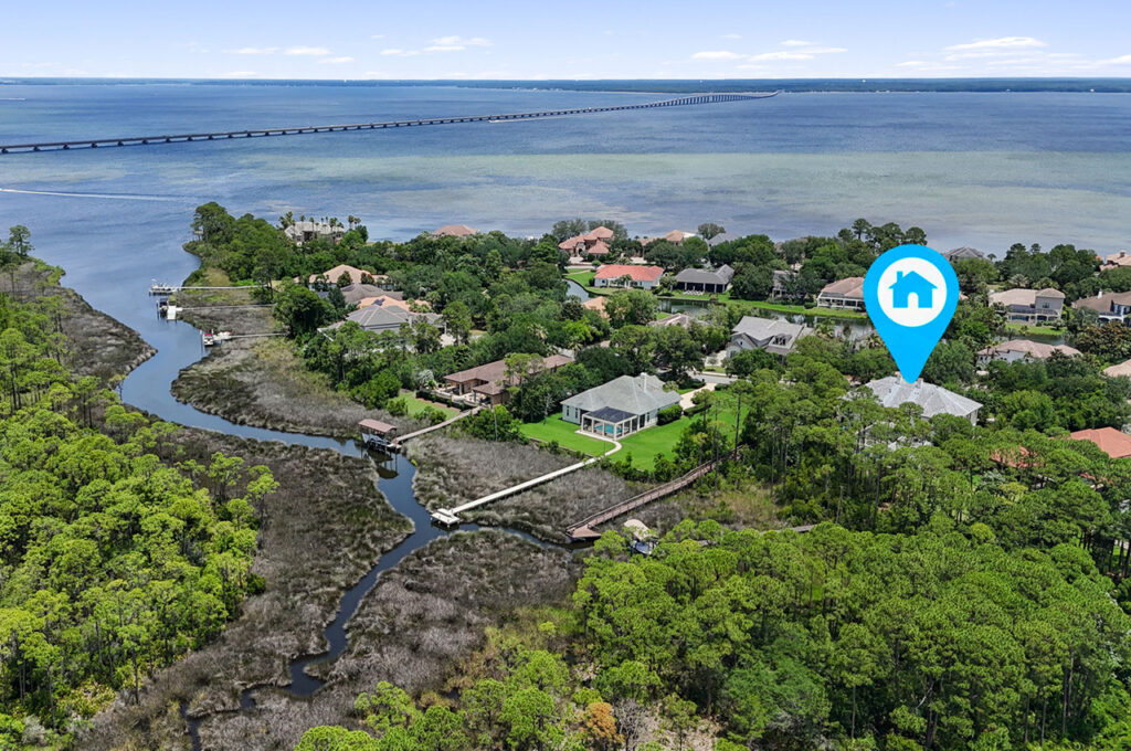 - Located at 434 Captains Circle, the three-story estate sits on 1.23 acres and includes more than 80 feet of bayfront, surrounded by sawgrass and a nature preserve. Built with insulated concrete forms (ICF), the home features nearly 9-inch thick poured concrete exterior walls.
