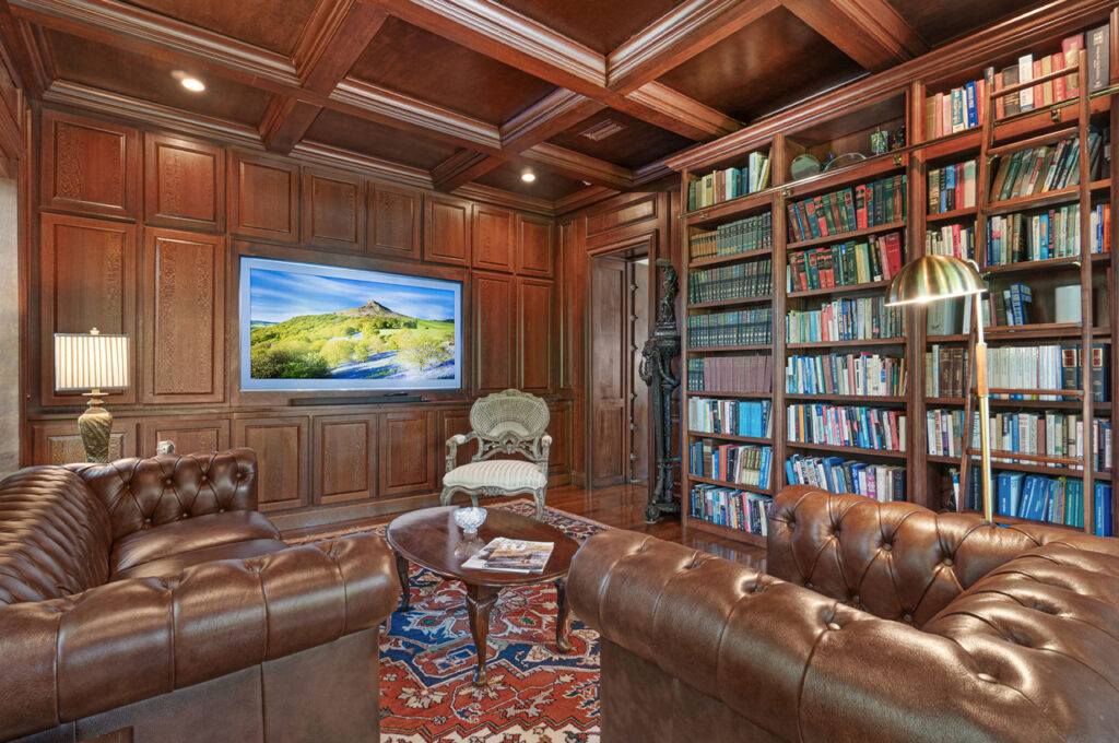 Main-level spaces include the formal dining room, a chef’s kitchen, living room, and two private studies. The kitchen features custom cabinetry, granite countertops, a walk-in pantry, breakfast bar, kitchen island, and high-end appliances, including a Sub-Zero refrigerator, Thermador double ovens, Viking gas range, microwave, dishwasher, and wine refrigerator.