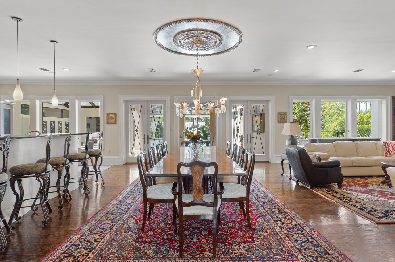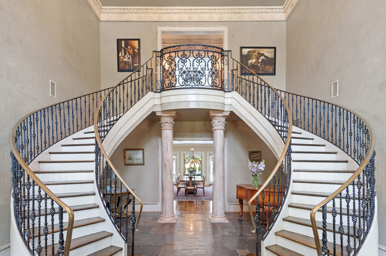 The home opens into a two-story foyer with a 22-foot domed ceiling, Italian marble columns, dual Juliette balconies, and a sweeping curved staircase. Hand-carved 8-foot mahogany doors mark the main entrance. Throughout the home, finishes include oak hardwood floors, Venetian plaster walls, and crown moldings ranging from 8 to 14 inches.