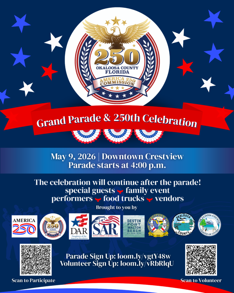Organizations, businesses, and community groups across Okaloosa County are invited to submit their America 250 events for inclusion in our community calendar.