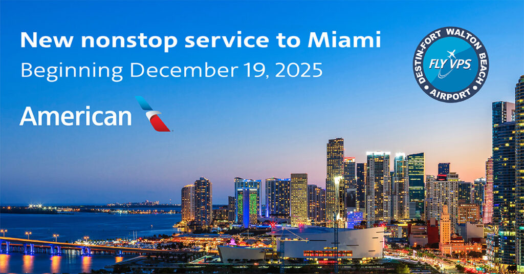 The Miami route will operate with dual-class Embraer 175 aircraft, departing VPS at 6 a.m. and arriving at 8:42 a.m. The return flight leaves Miami at 10:59 p.m., arriving back at VPS at 11:58 p.m.