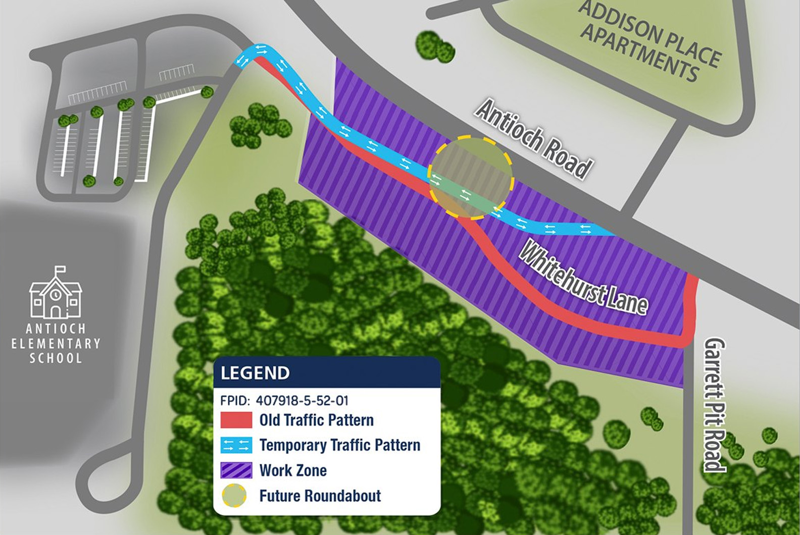 - The new traffic configuration is scheduled to be in place by Friday, July 18 at 6 a.m. The traffic shift will allow construction crews to build the future roundabout on Antioch Road.