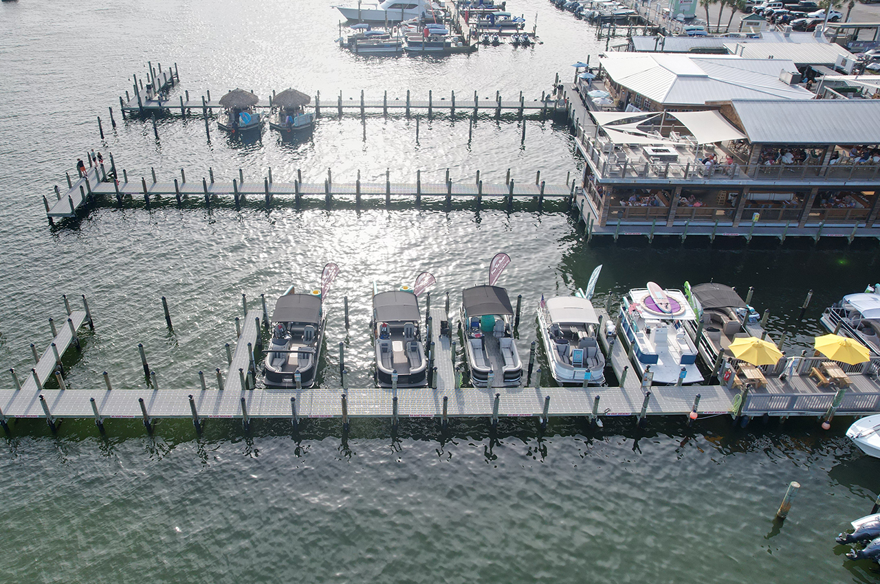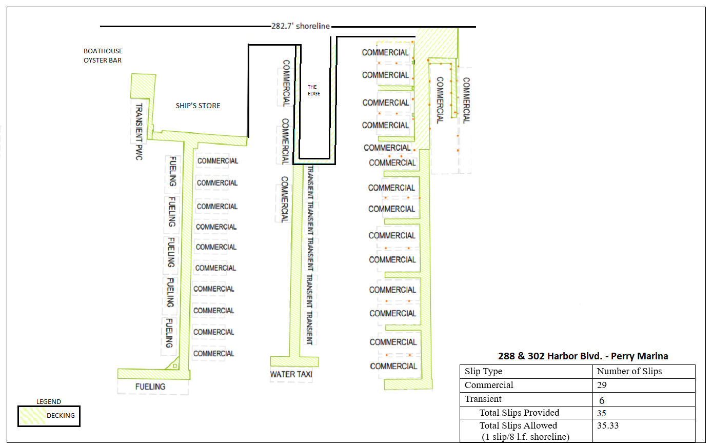 The marina currently operates 40 slips on 260 feet of waterfront (applicant states 282.7 feet in proposal graphic). According to city documents, the marina exceeds the maximum allowed slip density under current Land Development Code requirements, which permit 32.5 slips based on waterfront footage.