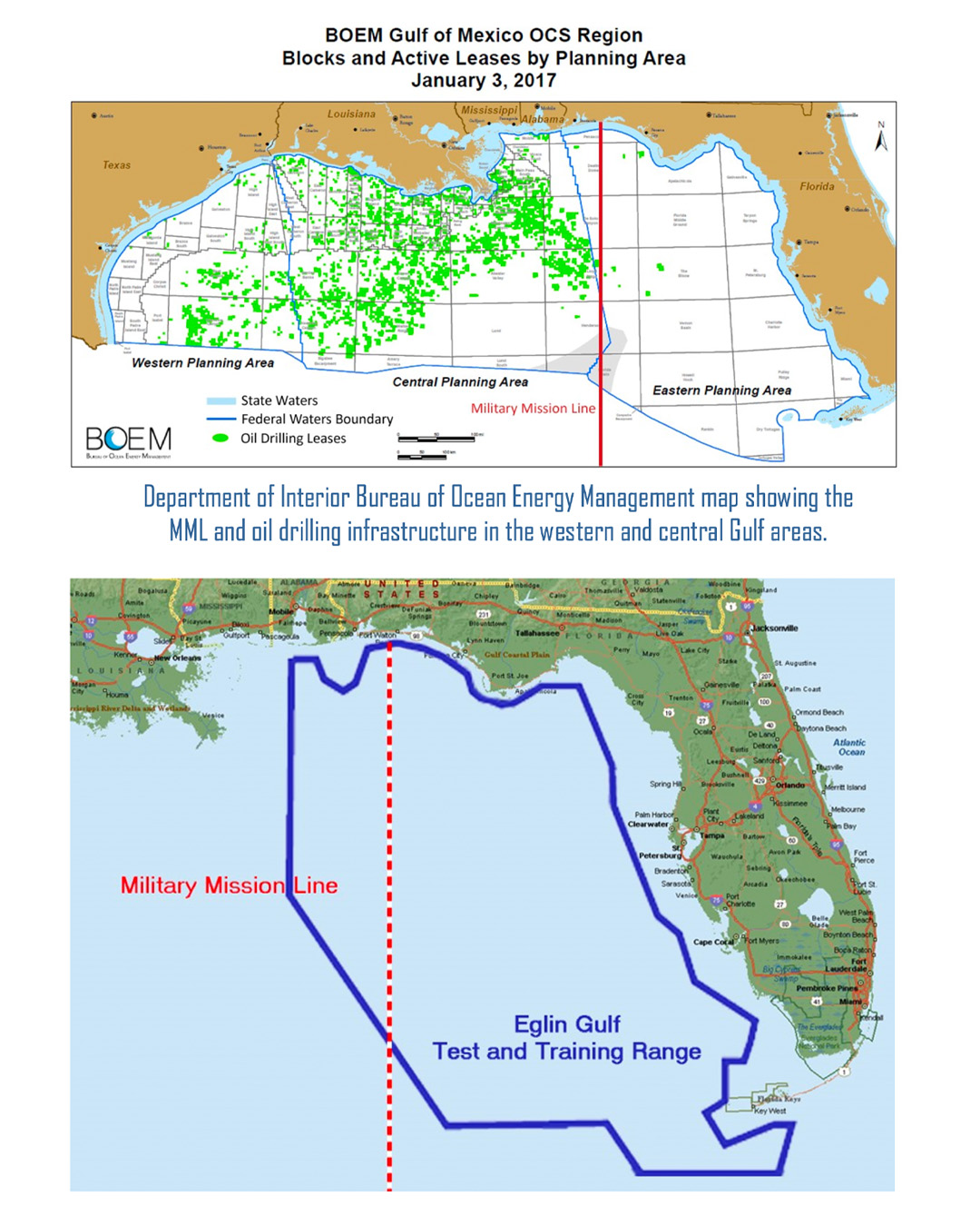 - BOEM’s five-year plan, released Nov. 20, includes a portion of the eastern Gulf of Mexico. The agency had proposed a 100-mile buffer around Florida’s coast, but according to the EDC, that buffer would fall in the middle of the training range.