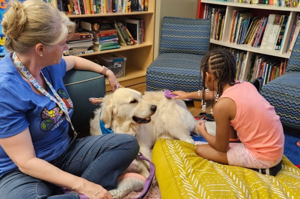 The nonprofit offers structured literacy support through its READing Paws program, supports humane education classes in libraries for children and families, conducts hospital visits for patients and staff, and provides wellness visits for at-risk youth.