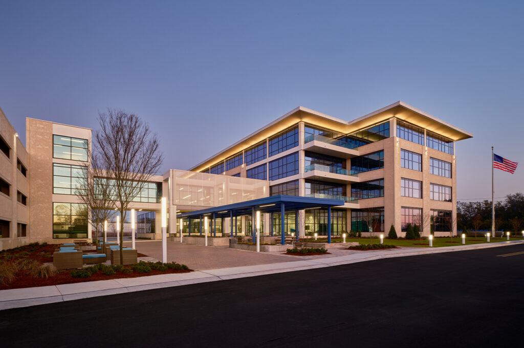 - The four-story, 100,000-square-foot building in Fort Walton Beach includes an attached parking garage and can accommodate up to 400 employees. The facility features energy-efficient windows, geothermal wells, charging stations for electric vehicles, and flexible interior workspaces designed for employee comfort and efficiency.
