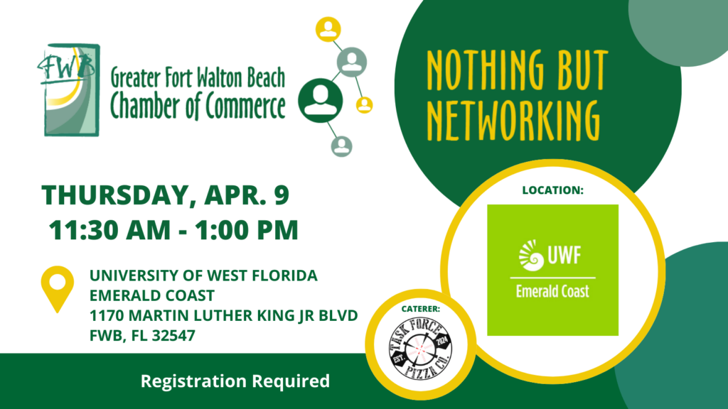 Start your morning networking at the Crestview Chamber’s April Networking Breakfast, sponsored by the Okaloosa County Tourist Development Department! It’s a great opportunity to connect with local professionals, build relationships, and promote your business. Pre-registration is available, or guests may pay at the door. Fee: $10 for members, $20 for non-members.