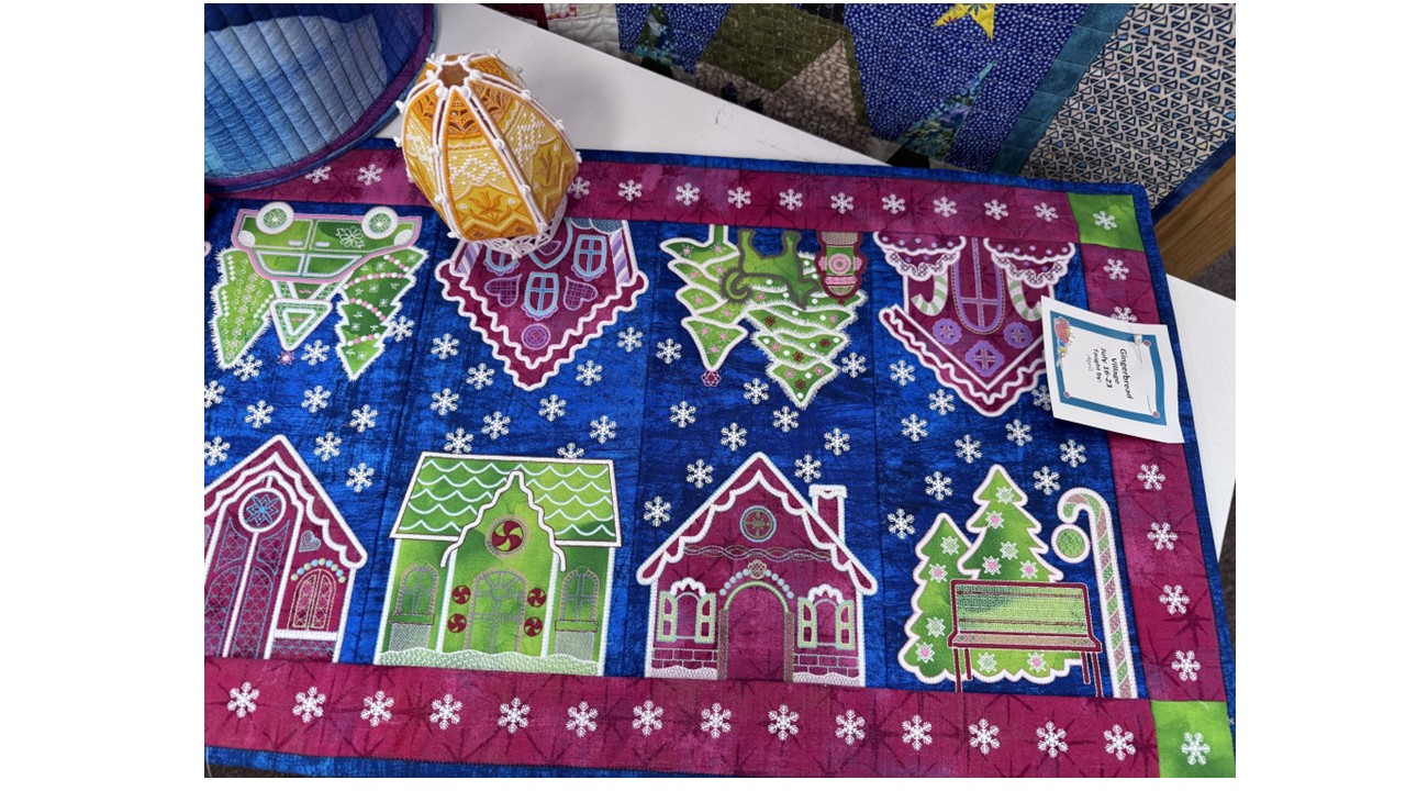 Bring your embroidery machine and stitch along with us to create the Gingerbread Village table runner.
