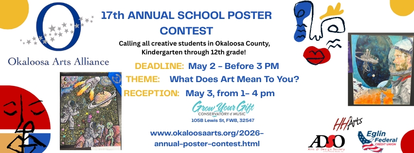 Arts and Design Society of Fort Walton Beach (ADSO) 17 First Street SE, Fort Walton Beach, Florida, United StatesThe Arts and Design Society of Fort Walton Beach (ADSO) invites you to experience the Kaleidoscope Gallery Show, a dynamic exhibition featuring artwork inspired by the colorful geometric patterns and ever-changing designs found in a kaleidoscope. This creative show highlights imaginative interpretations of color, symmetry, and movement by talented local artists. Exhibit Dates March 17 […]