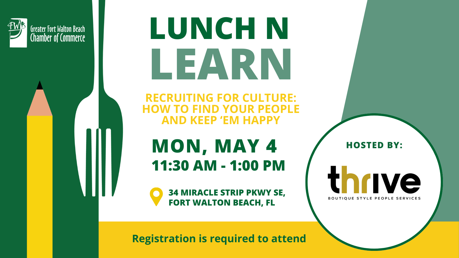 May 4 11:30 am - 1:00 pm Lunch N Learn: Recruiting for Culture: How to Find Your People and Keep ‘Em Happy Free