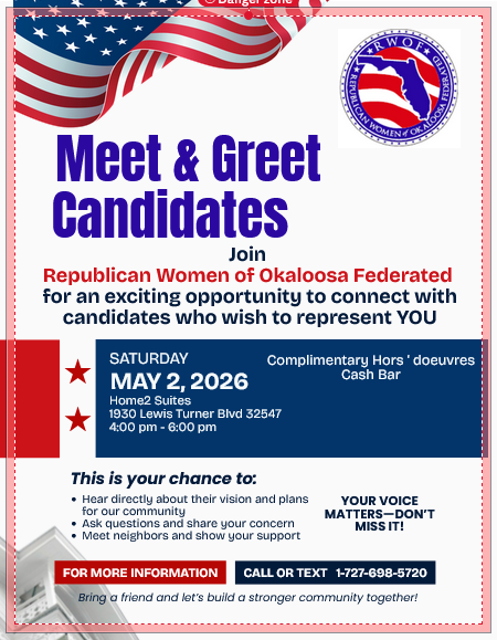 Join the Republican Women of Okaloosa Federated for an exciting opportunity to connect with candidates who to represent YOU. This is your chance to hear directly about their vision and plans for the community, ask questions and share your concerns, meet neighbors and show your support. This happy hour style event is free with complimentary […]