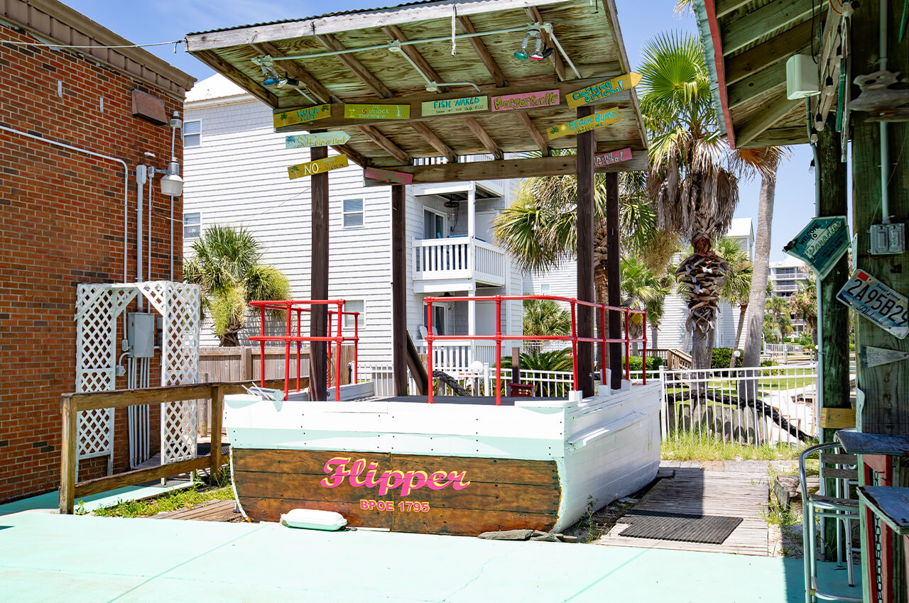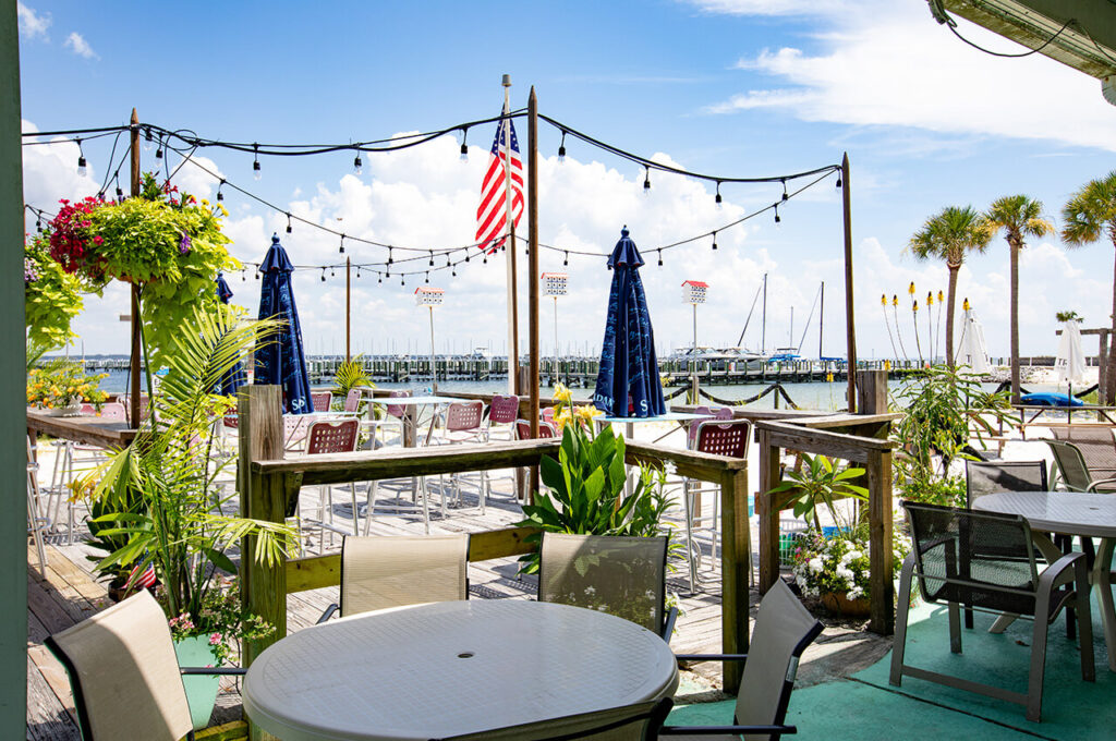 The original two-room facility has expanded significantly over the decades. The current building features a large ballroom seating 250-300 people, a smaller ballroom, commercial kitchen, game rooms with pool tables and darts, and social areas. Outdoor amenities include a tiki bar, covered seating areas, a bandstand created from part of an old charter boat donated from Destin, and a 100-foot dock on Choctawhatchee Bay.