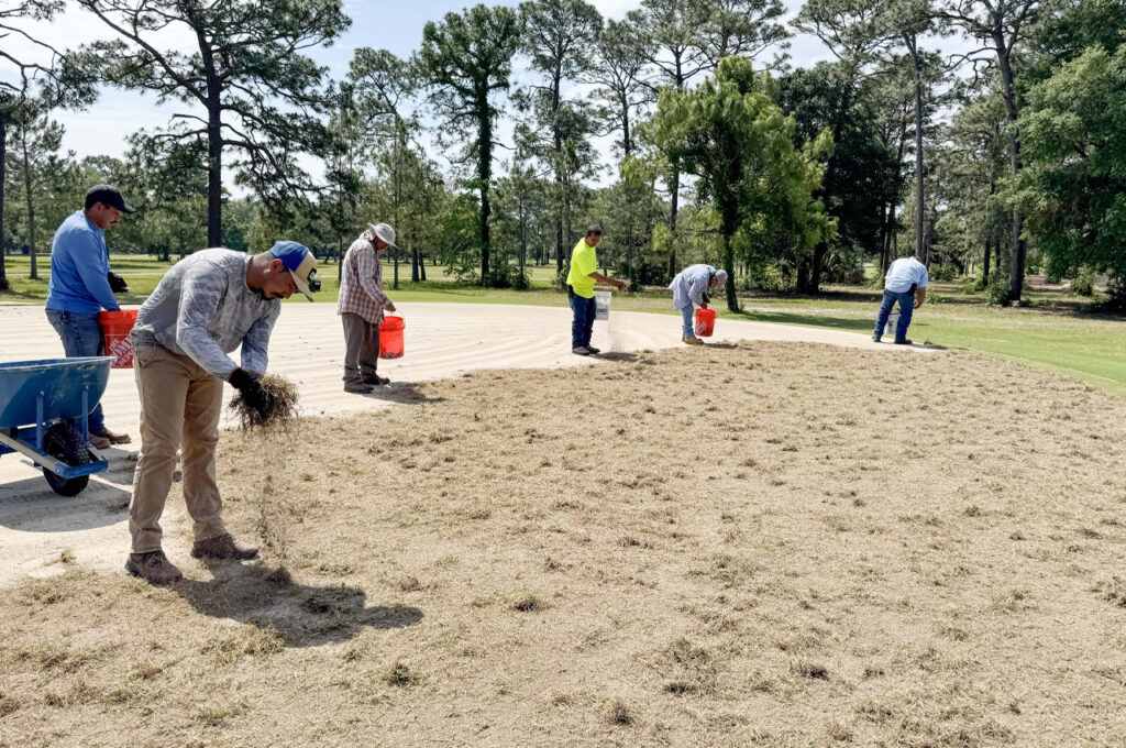 - Workers from King Villages Landscaping & Golf Construction Inc. have completed the removal of old sod and soil preparation, and are now installing TifEagle Bermudagrass sprigs across all 18 greens.