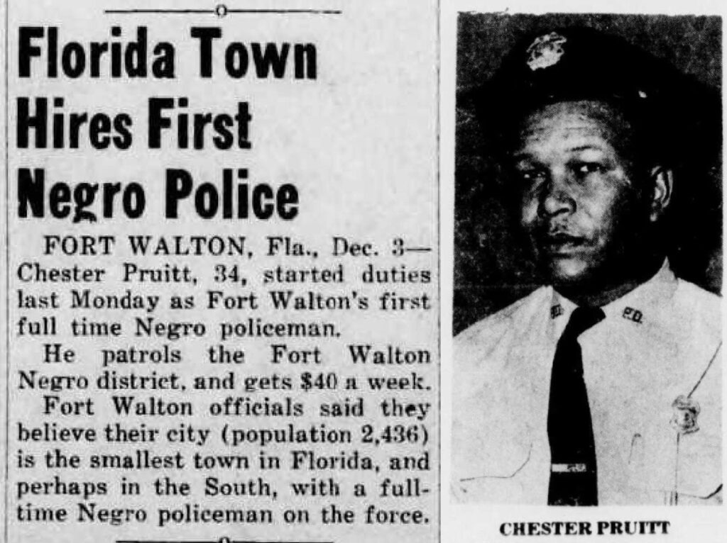 - During the public comments period of the August 12 meeting, Fearson delivered a comprehensive history of Chester Pruitt, who was hired as Fort Walton Beach Police Department’s first black police officer in 1948 and became a full-time officer in 1951.