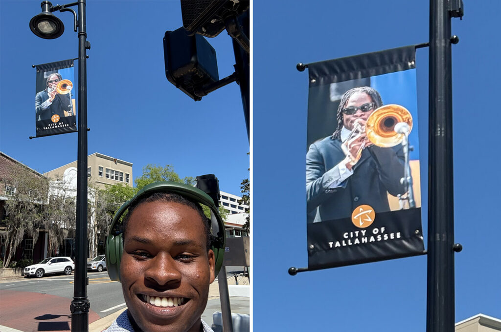 Harris transferred to FAMU in the fall of 2023, where he met Robert Griffin, the university’s Director of Bands. Harris quickly became section leader of the jazz band and began performing at venues and events across Tallahassee and beyond: the state Capitol building, the governor’s mansion, the Florida Black Caucus and the city’s bicentennial celebration, where a photo of his quartet later ended up on street banners downtown.