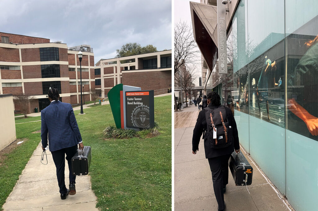 Harris was invited to audition in person. His audition date was March 3, the same date he had auditioned at FAMU years earlier. He even has side-by-side photos of himself walking to each audition, trombone case in hand.
