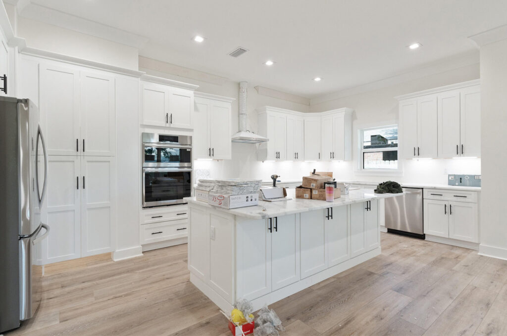 The open-concept interior includes soaring ceilings, recessed lighting throughout and a chef’s kitchen with a large island, marble countertops, custom backsplash and hidden butler’s pantry. The home features integrated surround sound in the living room, primary suite and master bathroom.