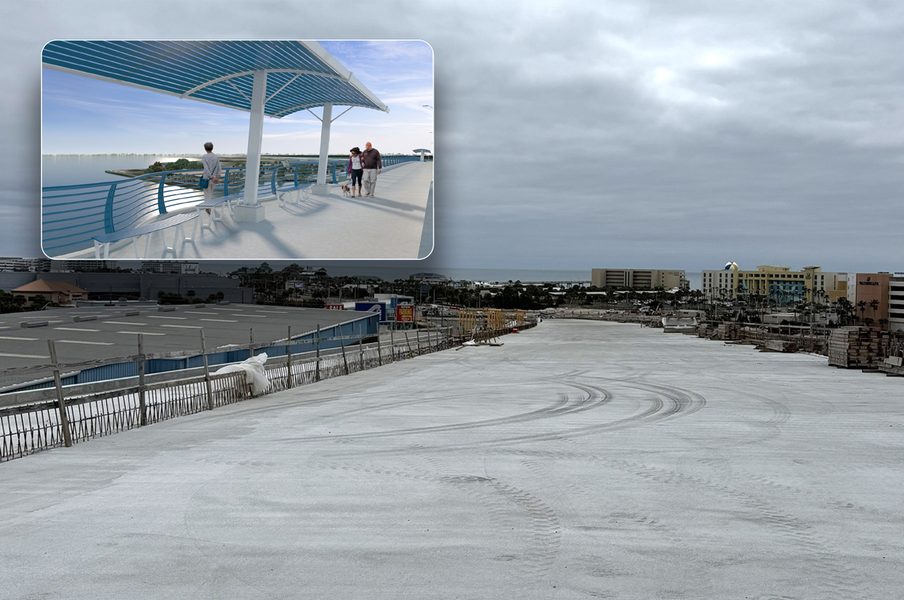 The rebar visible in recent photos forms the framework for the future barrier wall. To the left of the barrier wall, a 12-foot shared use path will feature shaded seating areas for pedestrians and bicyclists to enjoy panoramic vistas of the Santa Rosa Sound.