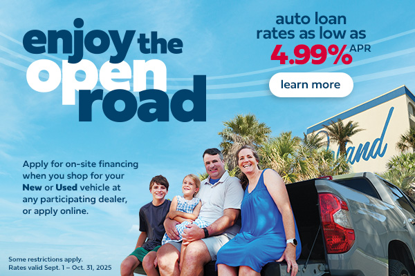 Enjoy the open road with rates you’ll love from Eglin Federal Credit Union. With auto loan rates as low as 4.99% APR, you can spend less time looking for the best rate and more time making memories! Apply for on-site financing when you shop for your New or Used vehicle at any participating dealer, or apply online at eglinfcu.org/auto.