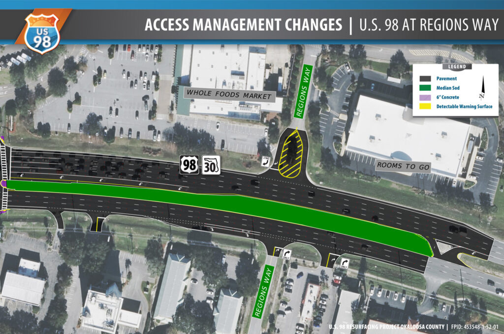 The median closure is part of a U.S. 98 resurfacing project extending from Paraiso Boulevard to Regions Way. FDOT says the permanent closure is required to improve safety and traffic flow along the corridor, which serves approximately 53,500 drivers daily.