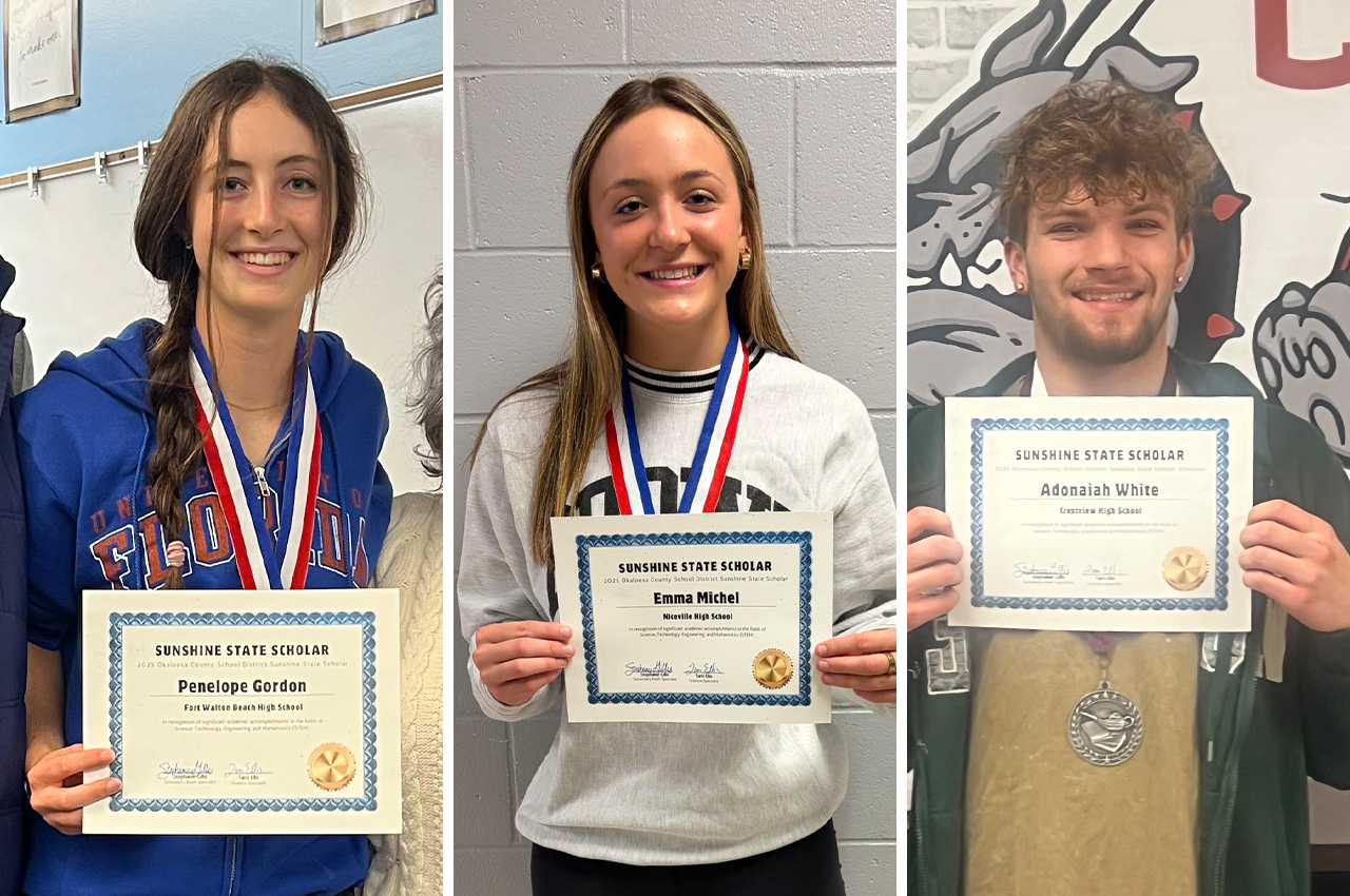 Fort Walton Beach High School’s Penelope Gordon and Niceville High School’s Emma Michel have been selected as Okaloosa County School District’s 2025 Sunshine State Scholars.