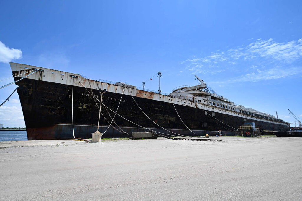 The vessel, which still holds the transatlantic speed record more than 70 years after its maiden voyage, is currently docked in Mobile, Alabama, undergoing final remediation following a 1,600-mile tow from Philadelphia that took approximately 12 days.