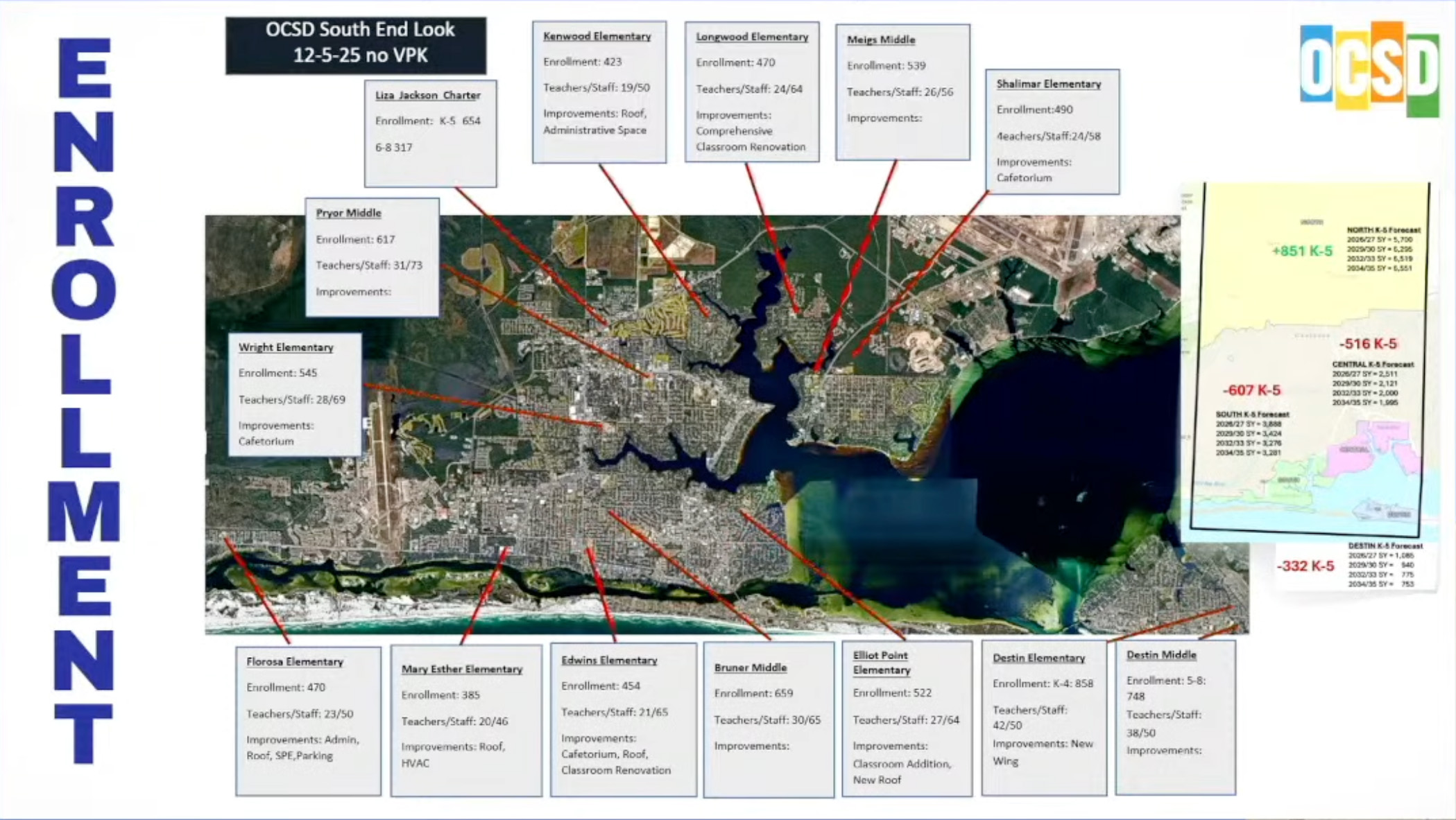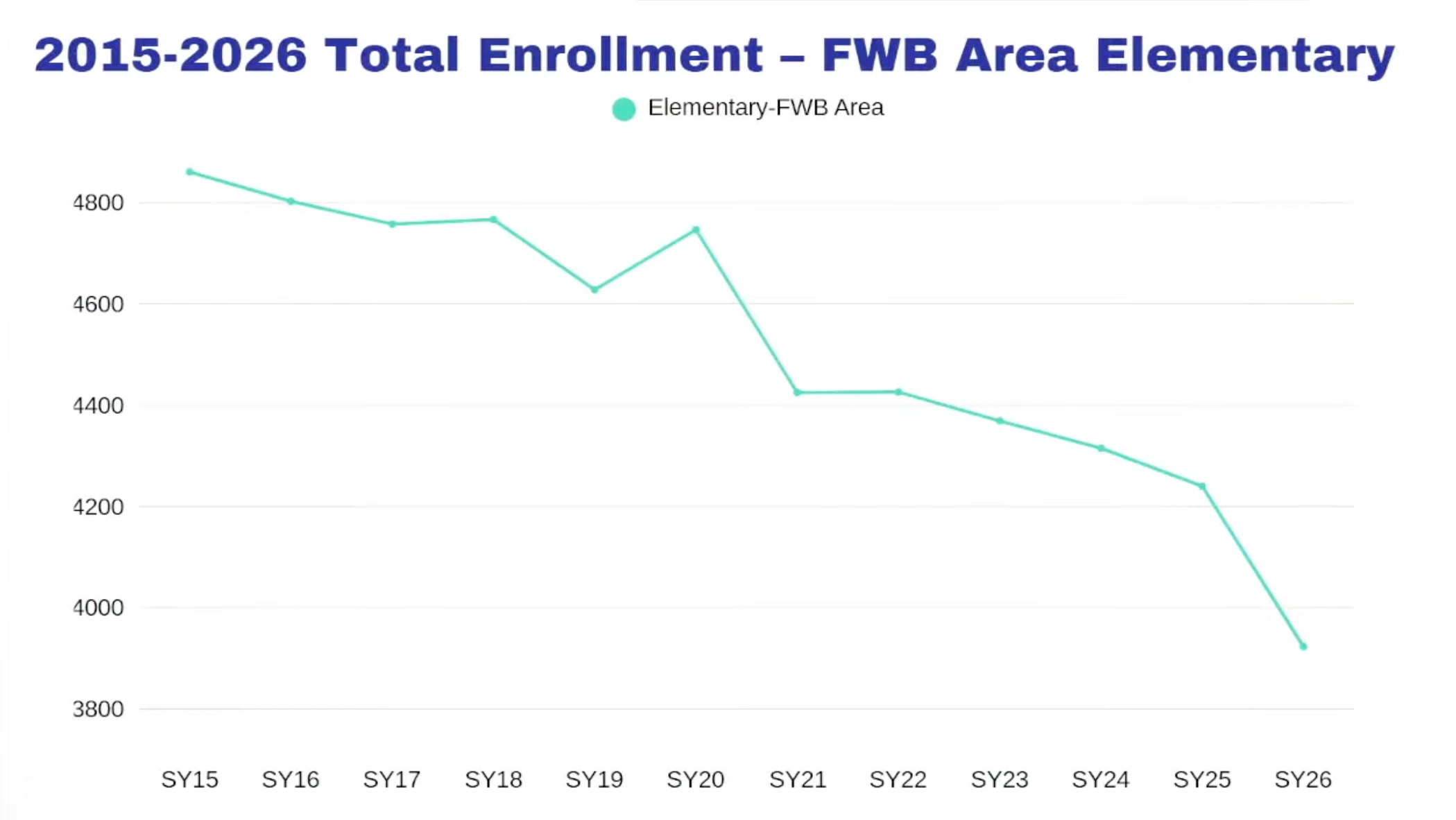 An 11-year enrollment analysis presented to the board showed Fort Walton Beach area elementary schools declining from more than 4,800 students in 2015 to below 4,000 students currently.