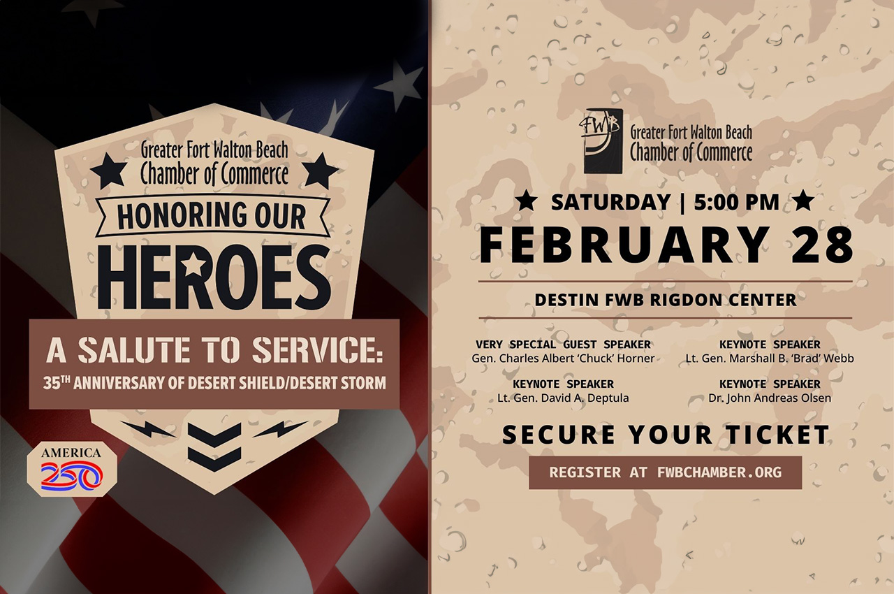 The Greater Fort Walton Beach Chamber of Commerce will host Honoring Our Heroes: A Salute to Service on Saturday, Feb. 28, 2026, at the Destin-Fort Walton Beach Rigdon Center to commemorate the 35th anniversary of Desert Shield and Desert Storm.