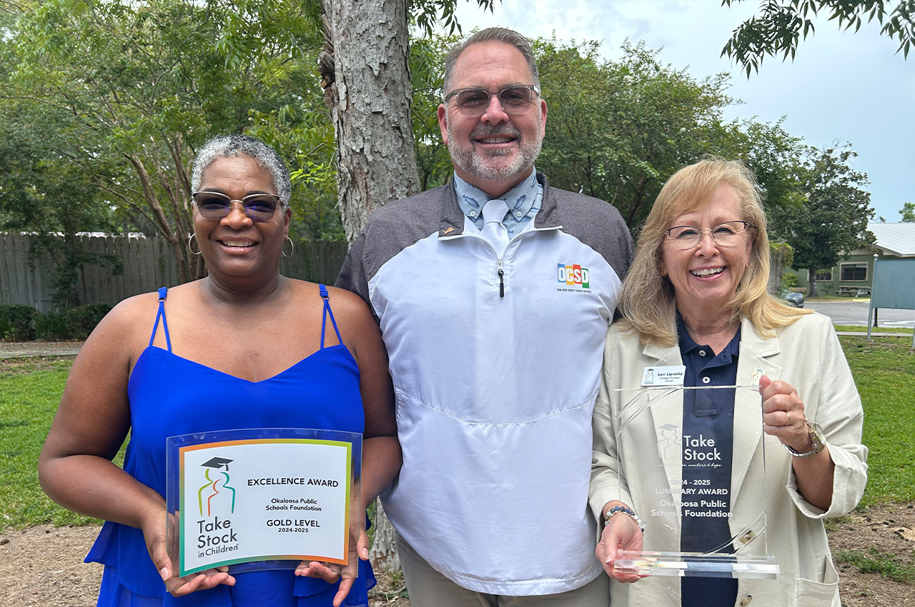 The Okaloosa County School District’s Take Stock in Children program has earned Gold Level recognition and achieved the prestigious Luminary Award for earning a perfect score of 100% on the 2024-2025 Balanced Scorecard assessment from the state TSIC office.